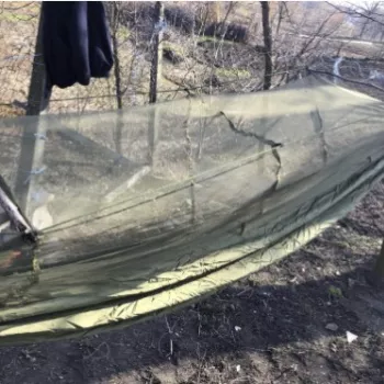 I do a lot of "bivouac" camping (courtesy of the Army) and dont usually have space to pack any sort of tentage other than a poncho so I thought I would give this a try seeing as how I've had a lot of back problems over the past few years. I tried it out a couple weeks back for the first time during a field exercise in a heavily wooded area surrounded by water. The mosquitos were out with a vengance so it was nice to be able to jump in this at night and not have to worry about them. Setup was easy and thanks to the other reviews I knew not to tie the net off too high so it didn't tear. I ended up connecting the net strings to bungee cords to give them a little flex. I would definitely recommend this hammock to anyone who does a lot of backpacking. It tears down and packs away into the connected bag very easily (unlike any tent I have ever owned).