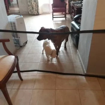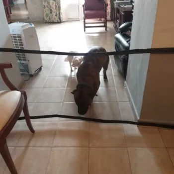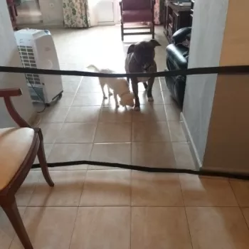 The gate worked fine for puppies, but now our 20 pounds dogs have pulled this thing down a few times. The issue I really have is with the sticky hooks on the wall. The sticking is so strong, so the paint came off the wall when my dogs pulled the net down. Guess there could be something to prevent it.