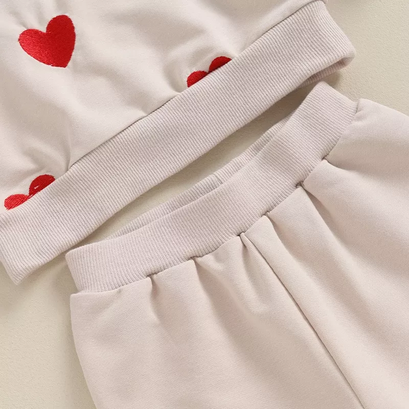 Adorable Heart Embroidery: The centerpiece of this outfit is the exquisite heart embroidery on the sweatshirt, adding a playful and loving touch.
